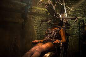 All of this is told in flashback, as Melissa (Chelsea Edge) recounts to two police officers why she was found alive among a group of her dead fellow-students. This is not a spoiler, this is the first scene. As usual in this type of scenario, one of the officers (David Bamber) refuses to believe her, though this may be a ruse as he repeatedly demonstrates that he’s more interested in baiting Melissa into a philosophical debate about the definition of art than in getting to the bottom of things. Still, Melissa gets as far as explaining that all of this really has to do with a former student, Garth Stroman (Ivan Kaye), who got bored with conventional and even unconventional art and turned instead to murder. After all, don’t they always say, “cruciato ad veritatem” (pain [leads] to truth”)?